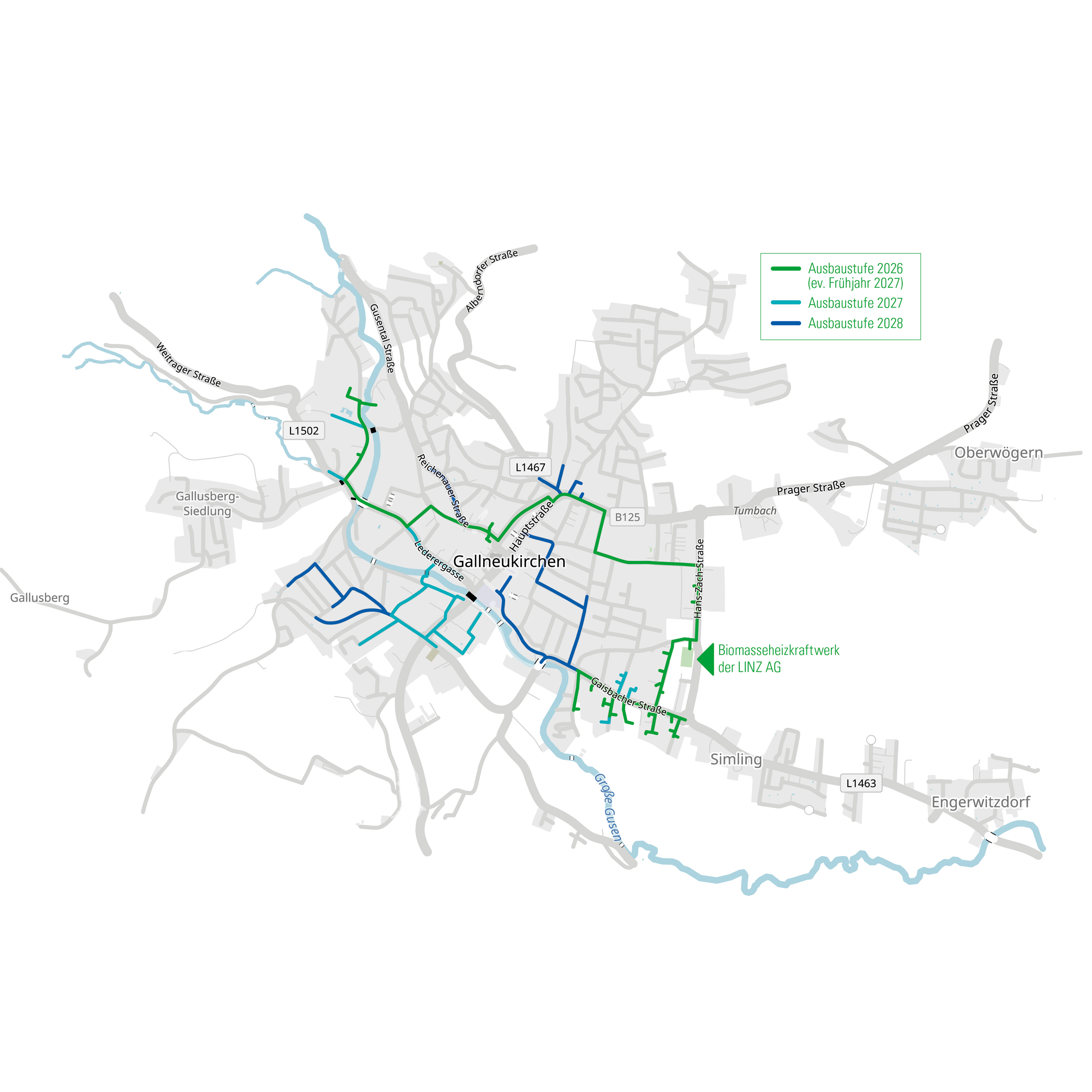 Der Netzplan (JPG, 760 kB) veranschaulicht den schrittweisen Ausbau des Naturwärmenetzes im gesamten Versorgungsgebiet Gallneukirchen und Engerwitzdorf.